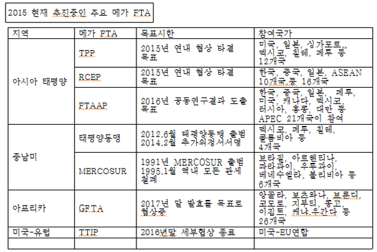 두 개의 국가간에 자유무역을 하자고 맺는 것이 FTA이라면, 메가FTA는 3개국 이상의 나라들이 하나의 FTA에 참여하는 것이다. 우리 나라와 관련이 있는 메가FTA로는 TPP,RCEP 한중일FTA등이 있다. 이외에도 미국과 EU 간 TTIP도 점차 가시화되고 있다. Mega FTA는 경제적 영향이 크고, 또한 국제 무역규범의 변화를 초래할 것으로 예상되고 있다. 그 중에서 한국과 직접 연계가 있는 TPP와 RCEP는 그 규모면에서 이미 일반화되어 있는 양자간의 FTA를 뛰어넘어 새로운 세계의 무역 질서를 세울 것이다.