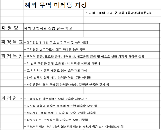 한국경제 신문사의 한경아카데미에서 해외 영업사원을 위한 무역 마케팅 과정을 개설하기로 하였습니다. 과정은 아래와 같이 해외 영업을 담당하는 초급 사원을 대상으로 합니다. 무역실무에 대한 지식은 어느 정도 있다는 전제하에서 개설하는 과정입니다.
